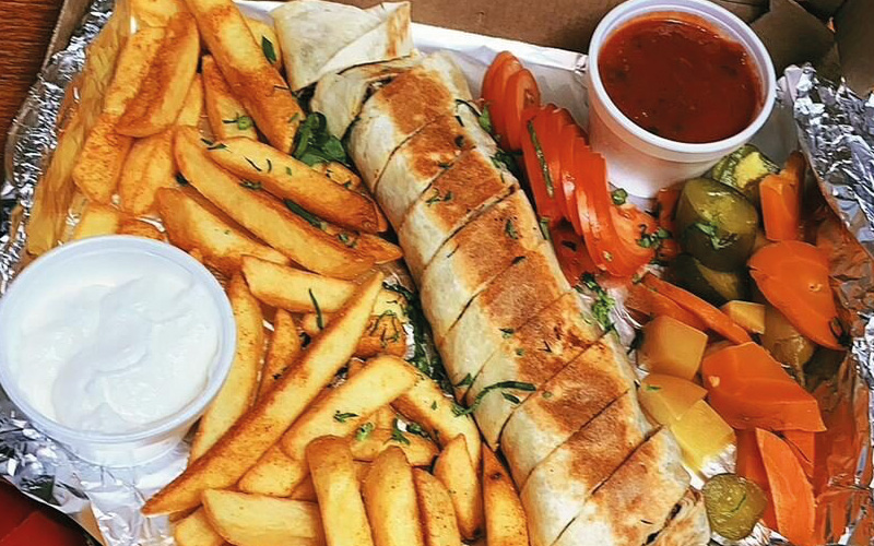 1 x Grilled Chicken Wrap with Chips and Coleslaw inside, comes with chips, and a tub of garlic and chilli