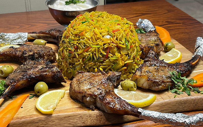 Charcoal grilled Lamb Chops marinated & served with or without garlic sauce & grilled veg