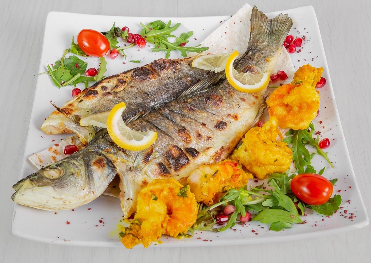 Seabass fish with grilled king prawns – Served with coleslaw rice or chips